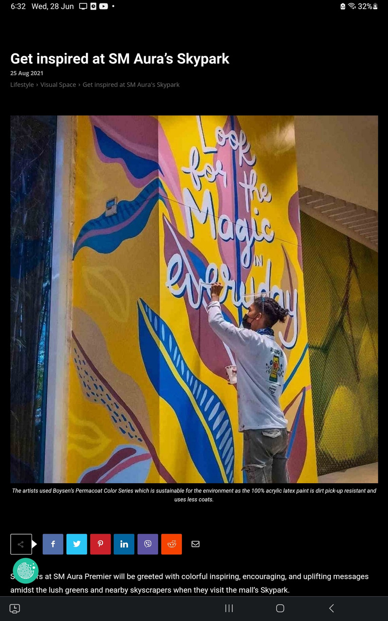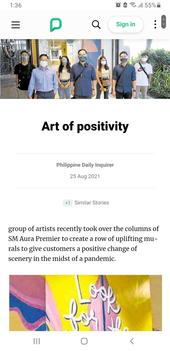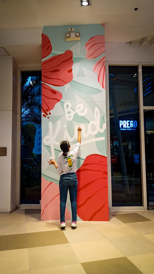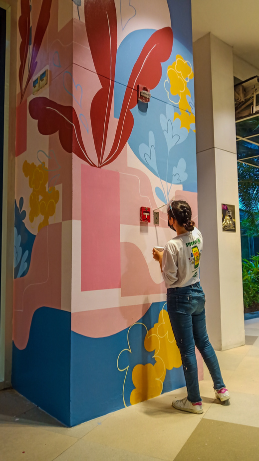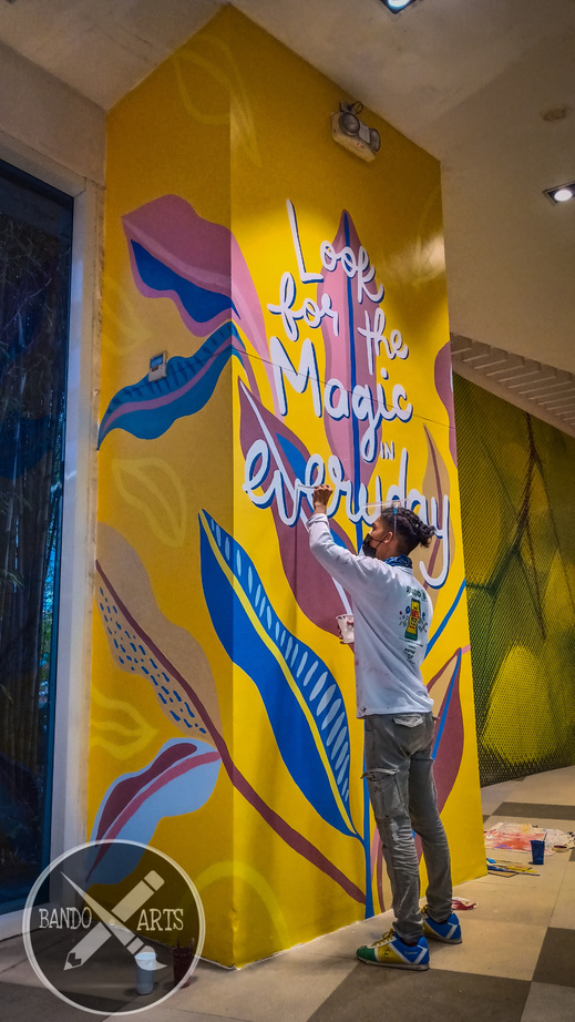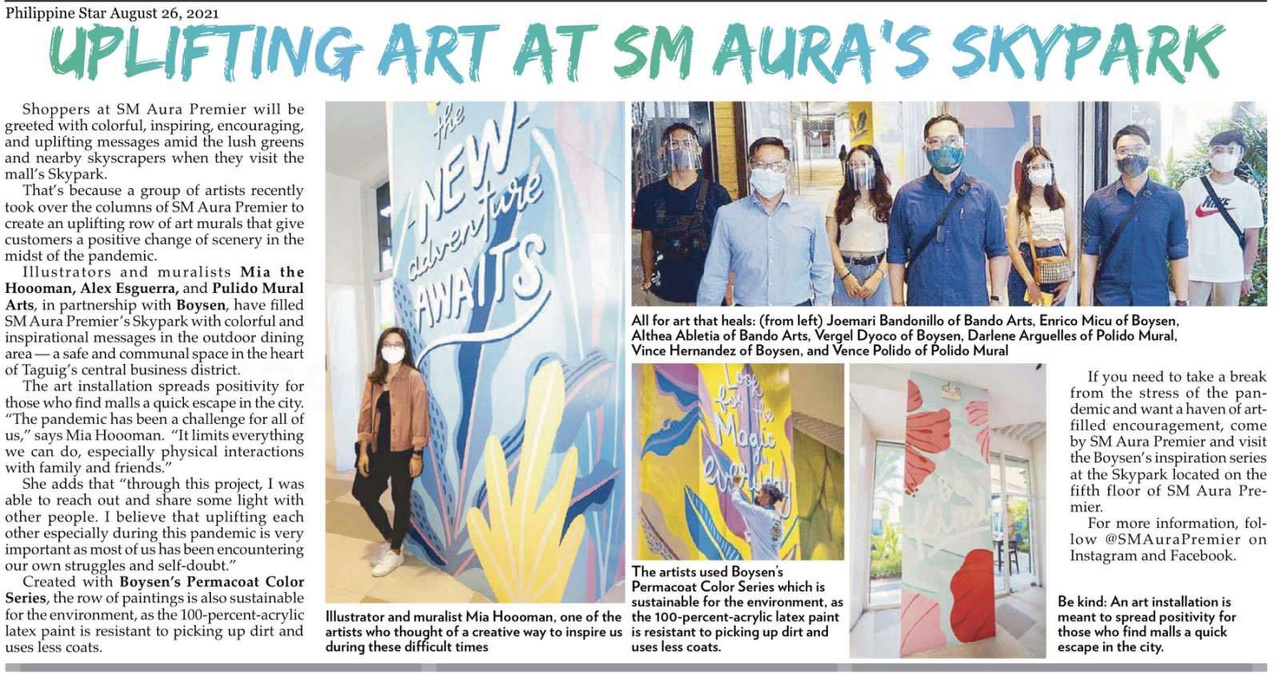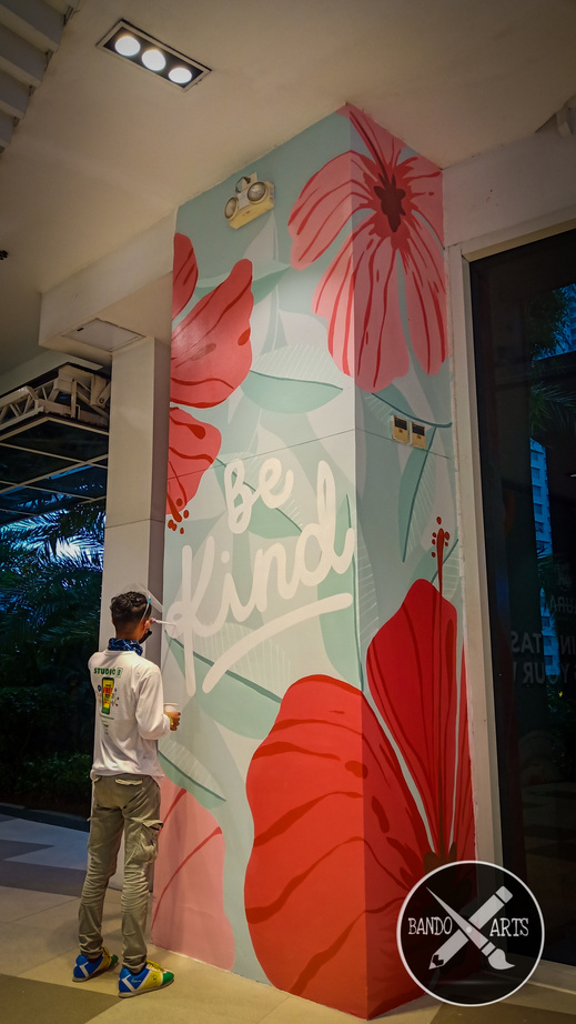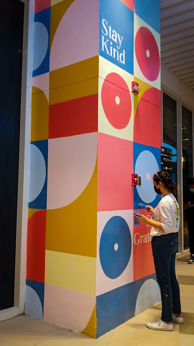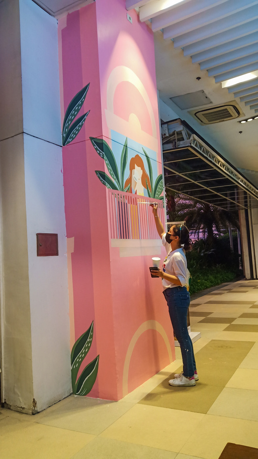 Inpartnership With Boysen Paint Philippines And with the Collaboration of Polido Mural Arts In Year 2021 We've Created a 14 Columns at Skypark 5th floor of Sm Aura we finish the mural around 20 days and the concept of the mural is bring positivity and joy to the place the Designed was created by the Artists Mia the Hoooman and Alex Esguerra .